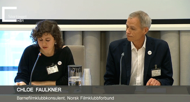 Det var barnefilmklubbmedarbeider Chloé Faulkner og daglig leder Jon Iversen som talte filmklubbenes sak på Tinget. De presenterte klubbenes og forbundets virksomhet og viste til hvordan filmklubbene gjennom sin demokratiske, frivillighetsbaserte virksomhet er med på å oppfylle viktige filmformidlingsoppgaver i lokalsamfunn landet rundt.